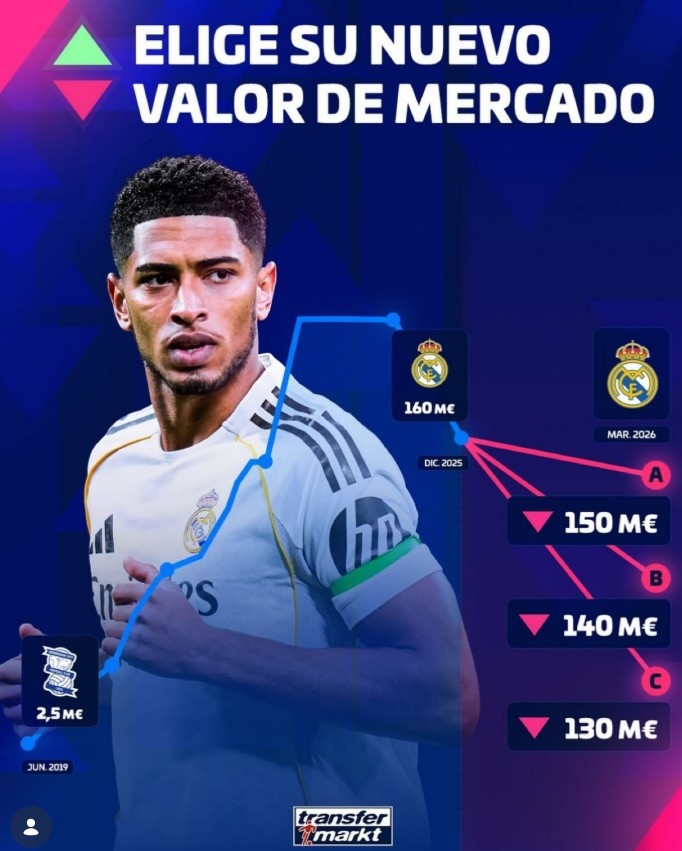 贝林厄姆目前身价1.6亿欧,而德转给出他在最新一期身价选项分别是1.5亿欧、1.4亿欧和1.3亿欧。