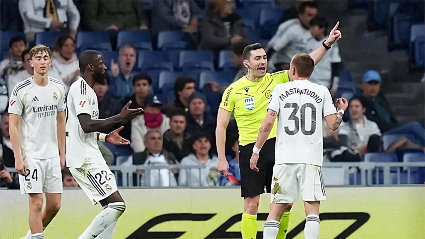 悲剧在终场前达到顶点。弗兰科·马斯坦托诺因对主裁判穆尼斯·鲁伊斯做出不当手势,被直接红牌罚下。维尼修斯也因情绪失控受到警告。短短几分钟内,皇马又折损两员大将,为这90分钟在技战术和心理层面的双重混乱画上了句号。
